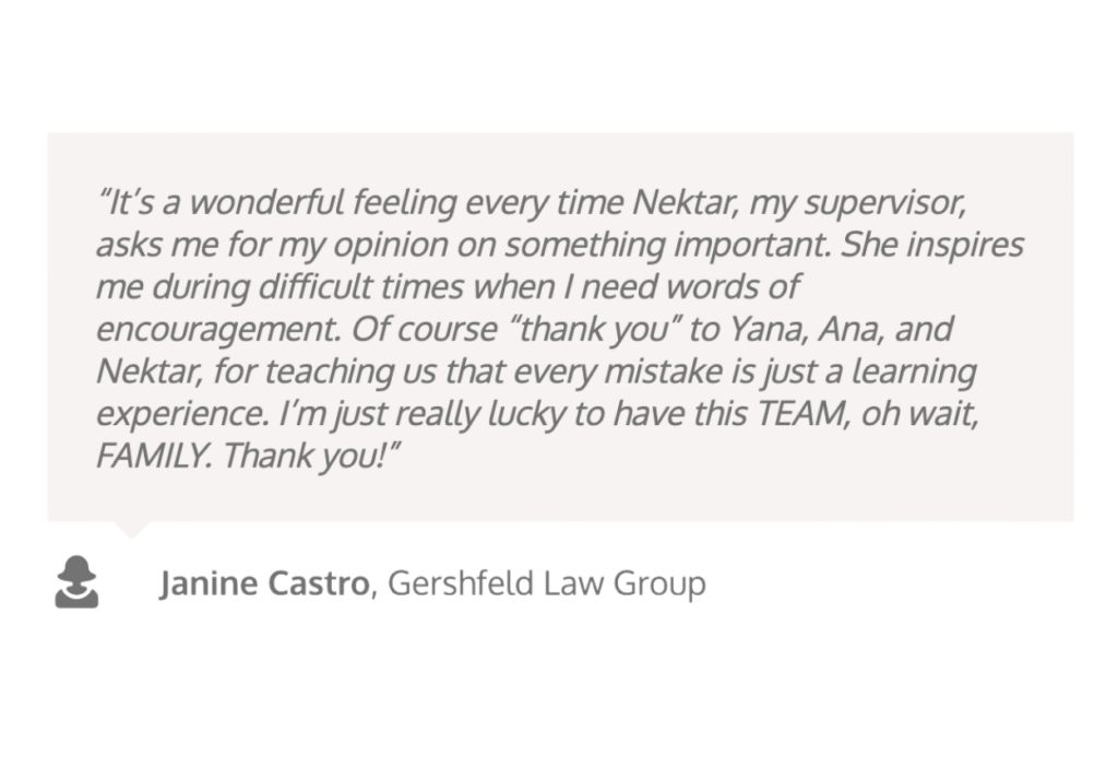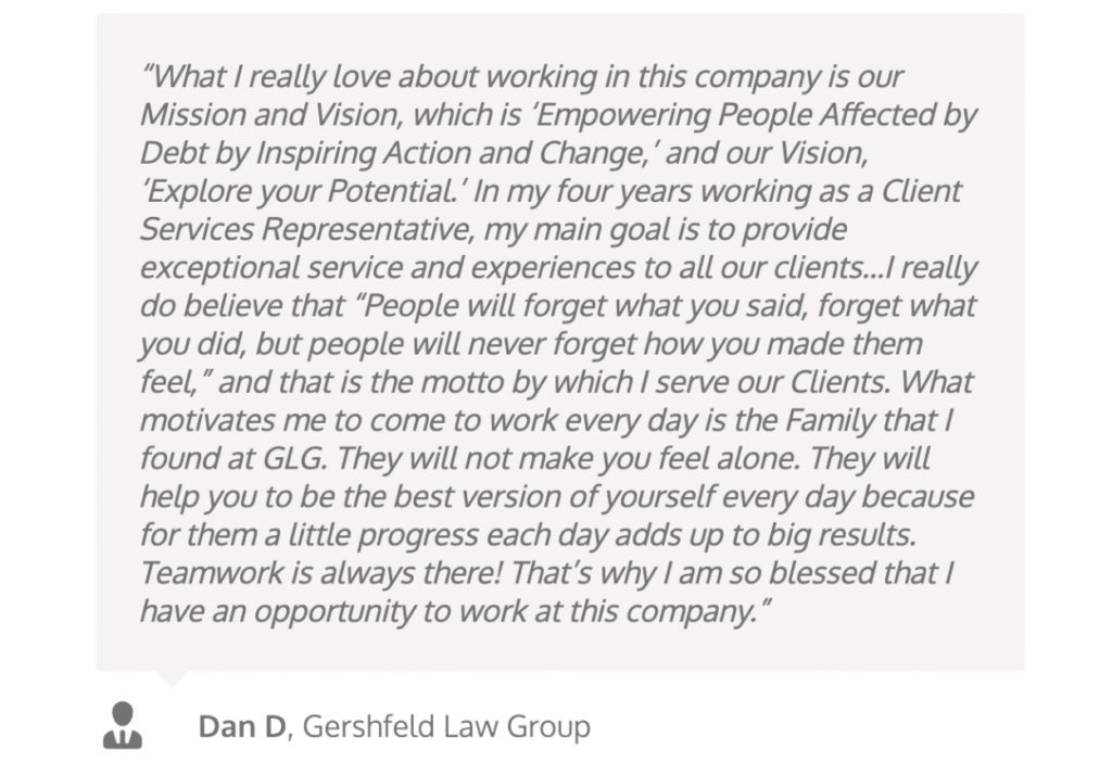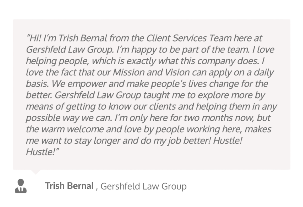 At Gershfeld Law Group, our motto is “Take care of your team members and they will take care of your clients and business.” Quite simply, our leadership team and our team members are our competitive advantage. They are the ones that make the magic happen! They zealously defend and advocate for our Clients. They properly advise and educate our clients so they can make the best, fully-informed decisions. They provide our clients with the most empathetic and compassionate service and care, and they fight tooth and nail for the absolute best possible settlements.